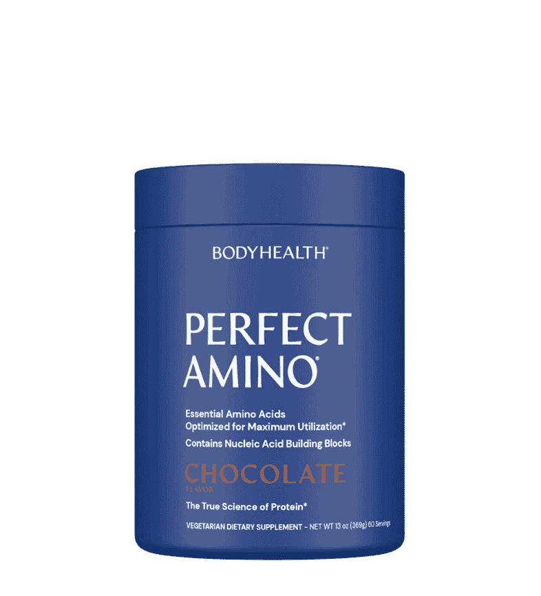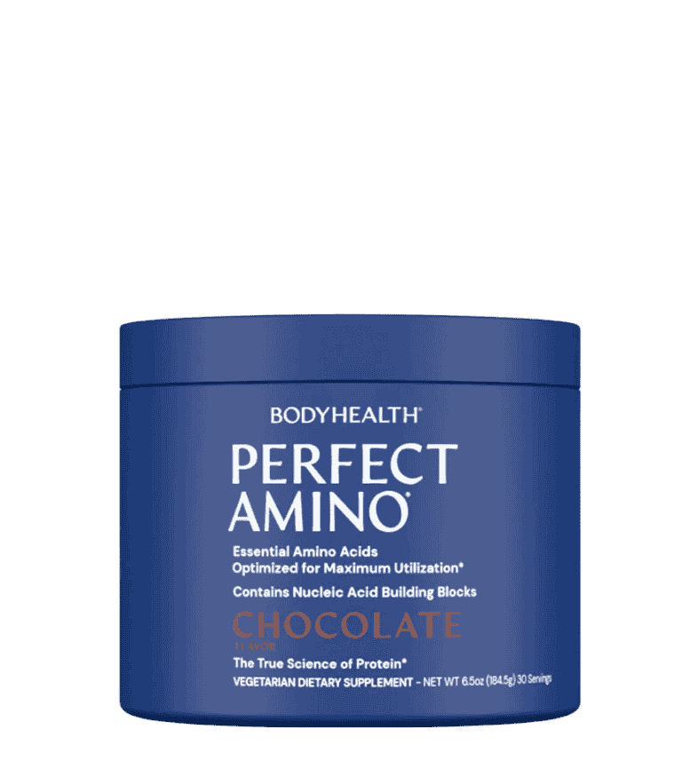 BodyHealth Perfect Amino Powder Chocolate offre un mélange optimisé d'acides aminés essentiels et de blocs de construction d'acides nucléiques pour la synthèse des protéines. 99% d'utilisation des acides aminés. Poudre pour boisson au goût chocolat. Convient aux végétariens et aux végétaliens. 30 ou 60 portions.
