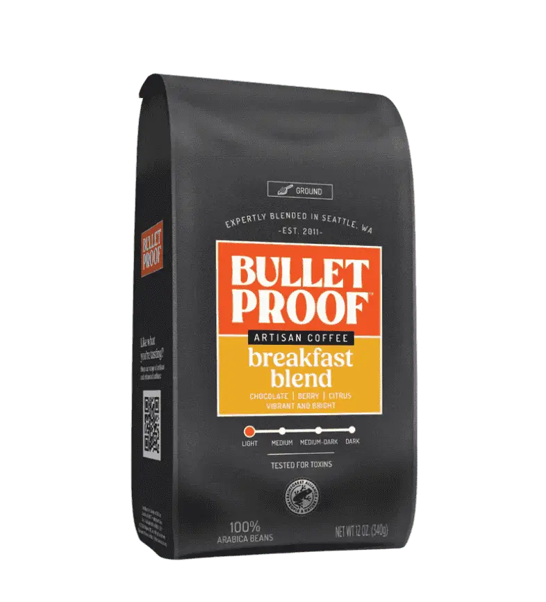 Un sachet de mélange de café moulu Bulletproof pour petit-déjeuner contient 340 grammes de café moulu.