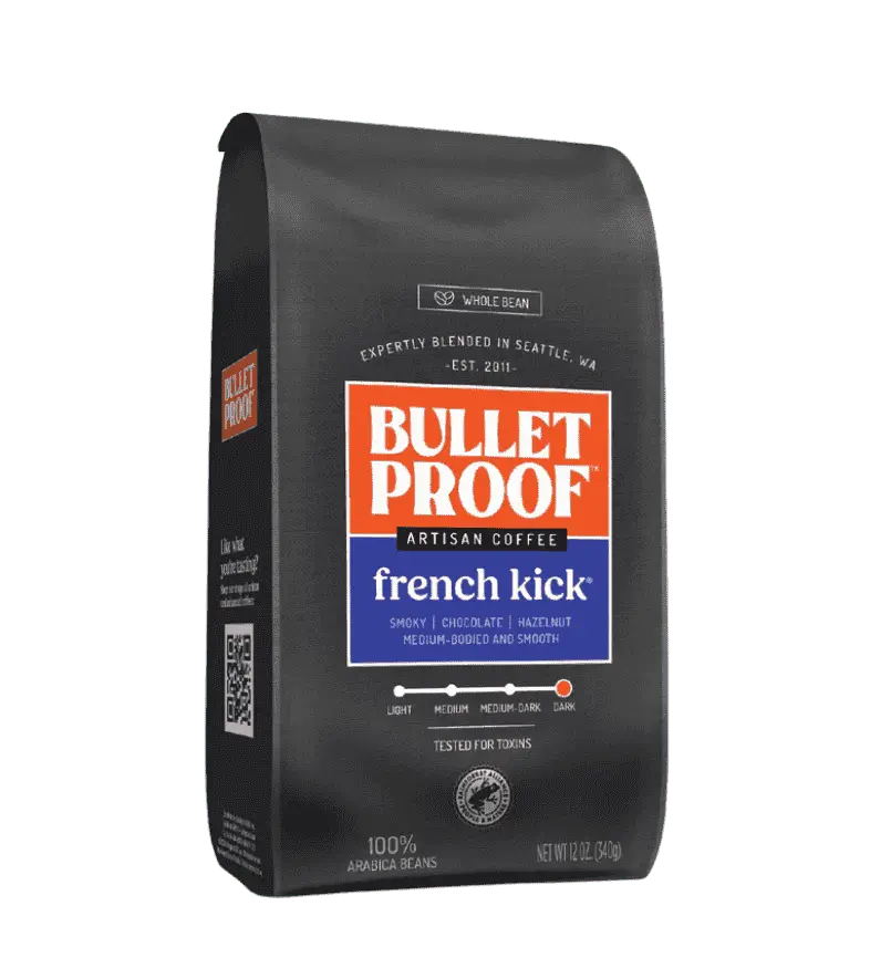 Bulletproof French Kick Dark Coffee : onctueux et sucré avec des notes de chocolat à cuire agréablement fumées, finitions nettes, corps moyen. 1 sachet de 340 grammes de grains entiers.