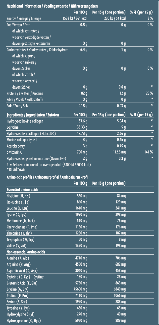 collagène bovin hydrolysé (Naticol®), L-glycine, collagène de poisson hydrolysé, arôme naturel d'orange, collagène de poisson de type II, poudre de concentré de jus d'acérola, membrane de coquille d'œuf hydrolysée (Ovomet®), acide malique.