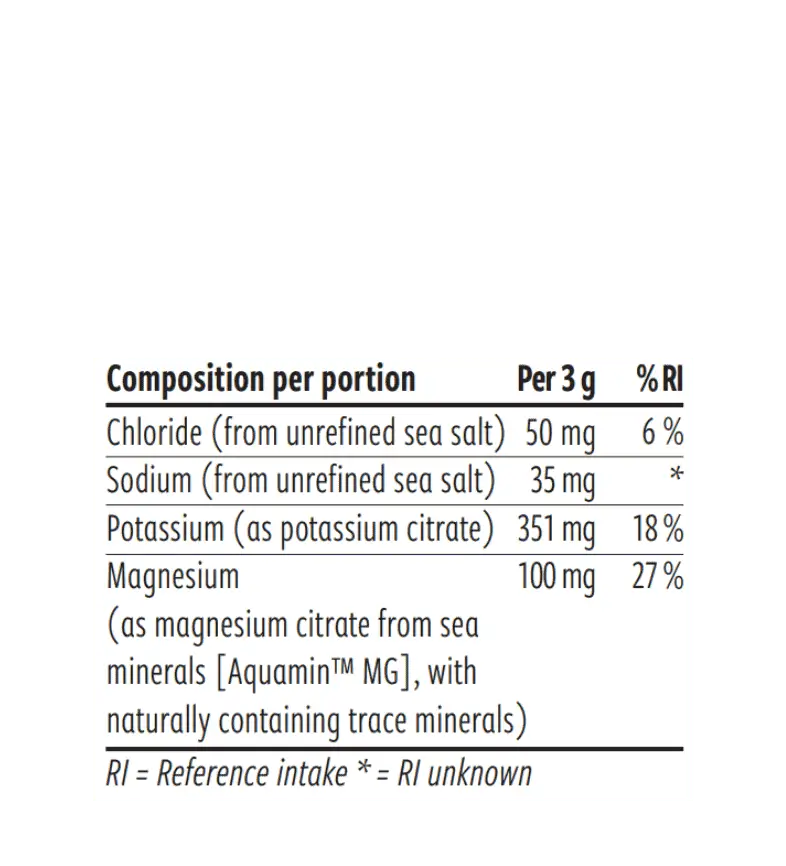 citrate de potassium, citrate de magnésium issu de minéraux marins (Aquamin™ Mg), glycine, arômes naturels, sel marin non raffiné, régulateurs d’acidité : acide citrique, acide malique, édulcorant : glycosides de stéviol de stévia.