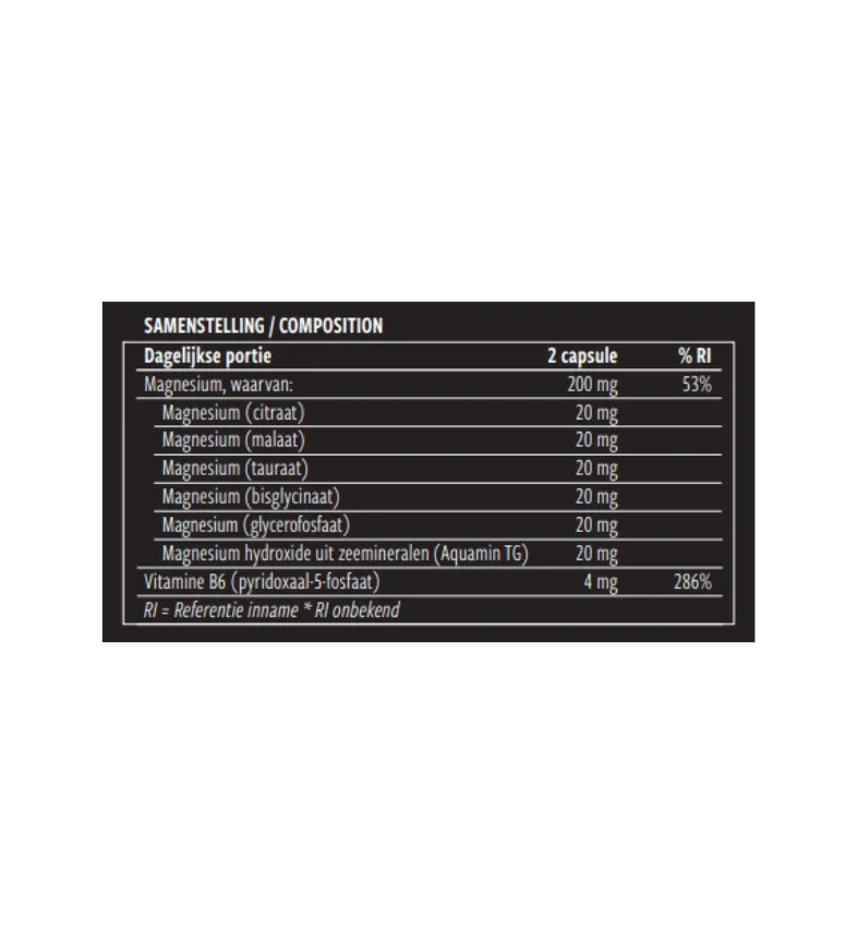 NoordCode Mag Six contient 6 types de magnésium avec de la vitamine B6. Haute biodisponibilité du magnésium, appuyée par la vitamine B6. Pour l’énergie, les muscles, les performances mentales, et plus encore. 100 mg de magnésium par capsule. 60 capsules, pour 30 jours.