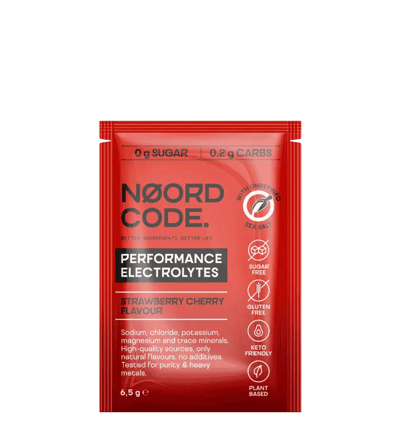 NoordCode Performance Electrolytes Strawberry Cherry vise à compenser les pertes en sodium et chlorure, les électrolytes les plus éliminés via la sueur et l’urine. Le sodium et le chlorure composent le sel (chlorure de sodium) et peuvent être facilement complétés via du sel.