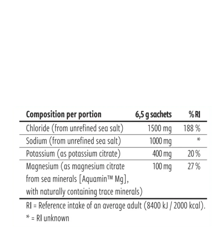 Sel marin non raffiné, citrate de potassium, citrate de magnésium issu de minéraux marins (Aquamin™ Mg Soluble), régulateur d’acidité : acide citrique, régulateur d’acidité : acide malique, arôme naturel, édulcorant : glycosides de stéviol de stévia.