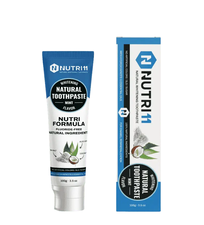 Nutri11 Natural Toothpaste est une formule quotidienne sans fluor, composée d’un mélange doux et pur d’ingrédients naturels. L’action blanchissante provient du bicarbonate de soude et du carbonate de calcium, sans agents de blanchiment agressifs.
